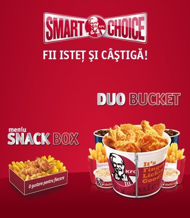 1. Fii istet! Desprinde abtibildul de pe Duo Bucket si poti castiga pe loc, produse Smart Choice (pepsi 0.4L, cartofi portie normala, copan picant, mini porumb si crispy sandwich)